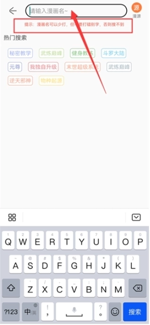 2、点击搜索框后,可直接输入想要查找的漫画名称。需要注意的是:这里输入的漫画名称可以不用完整输入,但务必确保没有错别字,不然可能会出现搜索不到结果或者搜到的漫画与目标不符的情况。