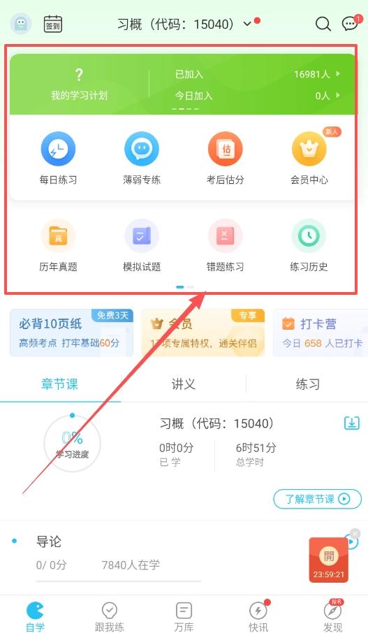 2、于首页处寻得“我的学习计划”,在此可参与每日练习中的薄弱专练,亦能做做历年真题,并且能够查看自身学习进度与总学时。