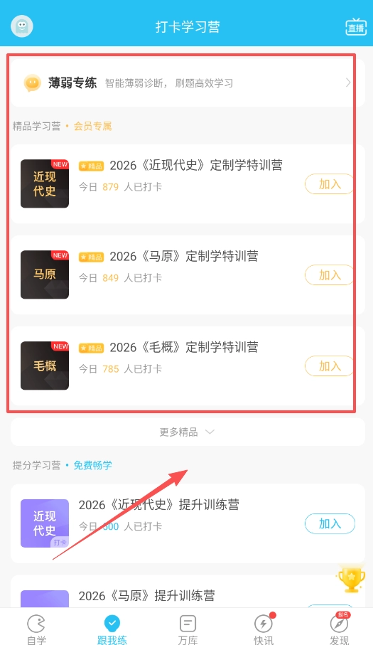 3、若想实现针对性提升,可以报名学习营,选择近现代史、马原或毛概的定制学特训营加入。在这里,能够借助智能诊断找出薄弱点,让刷题效率更高。