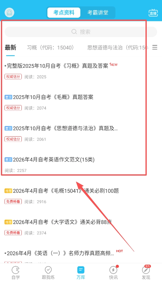 4、在考点资料中查找最新真题及备考资料,像2025年10月自考习惯真题,或是2026年4月毛概通关必刷题等。免费资料可直接查看。