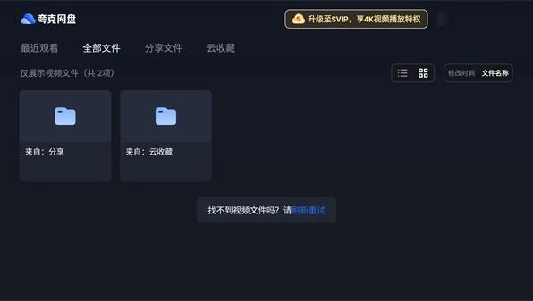 2、进入后默认显示全部文件夹,但实际仅展示视频文件,其他类型文件会被屏蔽;界面最上方是夸克网盘的名称,下方依次排列着最近观看、全部文件、分享文件和云收藏几个功能选项。