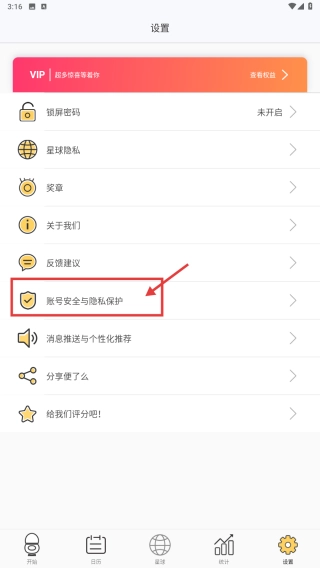 2、进入设置页面后,找到并点击“账号安全与隐私保护”选项,即可进入对应的隐私安全界面。