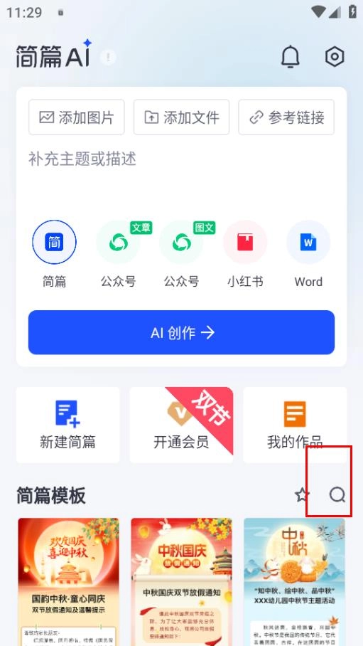 1、进入简篇页面后,若需搜索模板,点击简篇模板右侧的搜索图标即可。