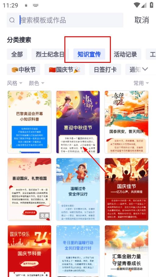 2、进入搜索页面后,选择“知识宣传”分类,从中挑选出你喜欢的模板,例如“喜迎中秋佳节”模板,点击该模板即可。