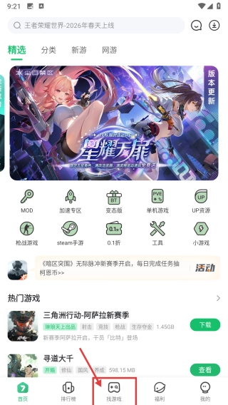 1、打开游戏类应用,点击底部的“找游戏”选项,进入找游戏页面。