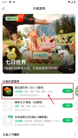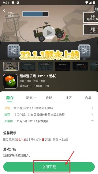 3、进入沙盒游戏页面后,找到并选择甜瓜游乐场32.1.1版本的游戏,随后进入该游戏的详情页面。