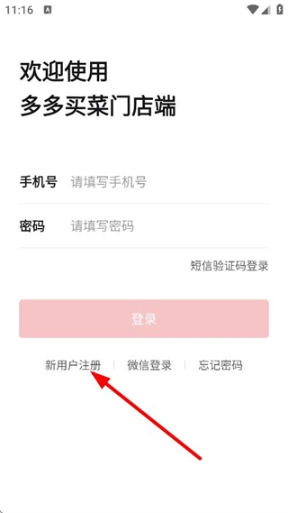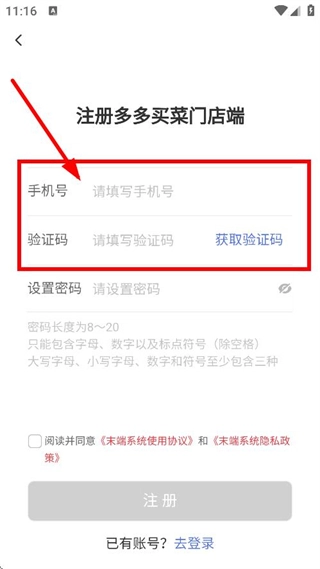在注册页面,填写手机号,点击获取验证码,再输入收到的验证码。
