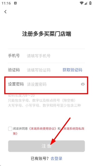 完成注册操作的步骤如下:先设置密码,接着勾选“阅读并同意相关协议”,最后点击注册按钮即可。