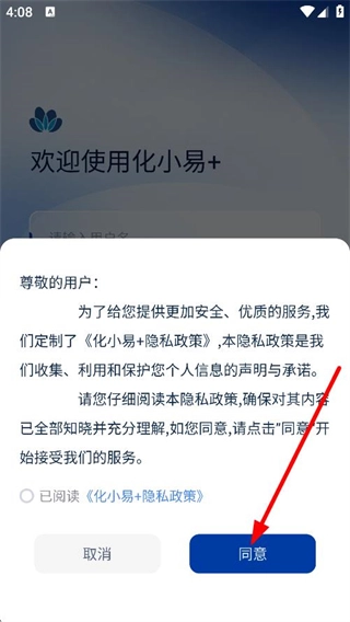 在化小易隐私政策弹窗里点击同意,就能进入登录页面。