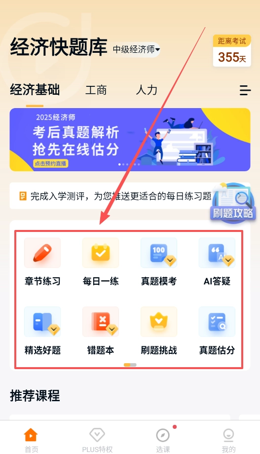 2. 登录之后进入主页,在这里你会看到中级经济师各个科目的入口以及考试倒计时。首先要完成入学测评,这样就能获取个性化推荐题目。