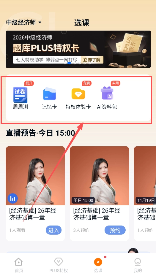 4、要是你打算升级学习工具,不妨了解一下PLUS特权卡。它涵盖了周周测、记忆卡等七项特权,而且在试卷专区,还能发现AI资料包与特权体验卡。
