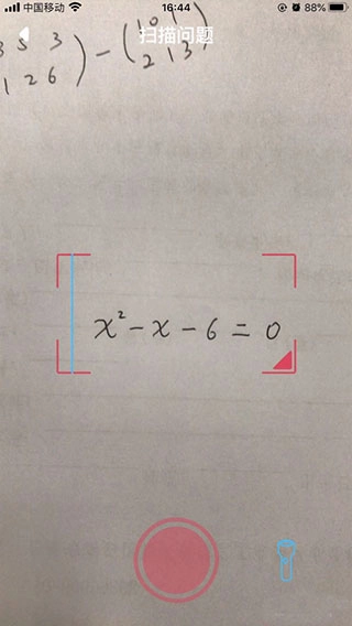 3、开启手机摄像头,把题目放置在屏幕提示的区域之中,接着点击下方的红色按钮。
