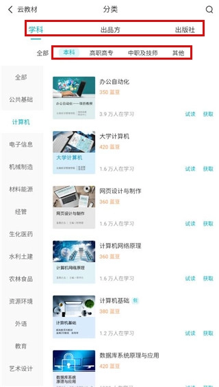 2、分类栏里可以按照学科、出品方、出版社来挑选课本,还可以按照本科、高职高专、中职及技师分类阅读课本