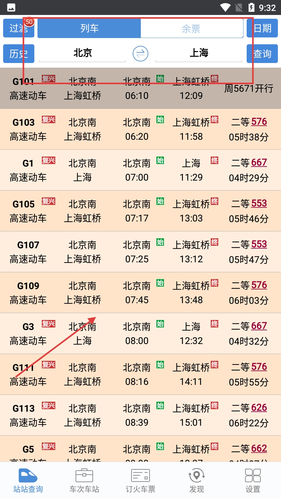 1、进入列车查询界面,确定出发地为【北京】、目的地为【上海】后,点击列车列表里对应的车次,例如【G101】。