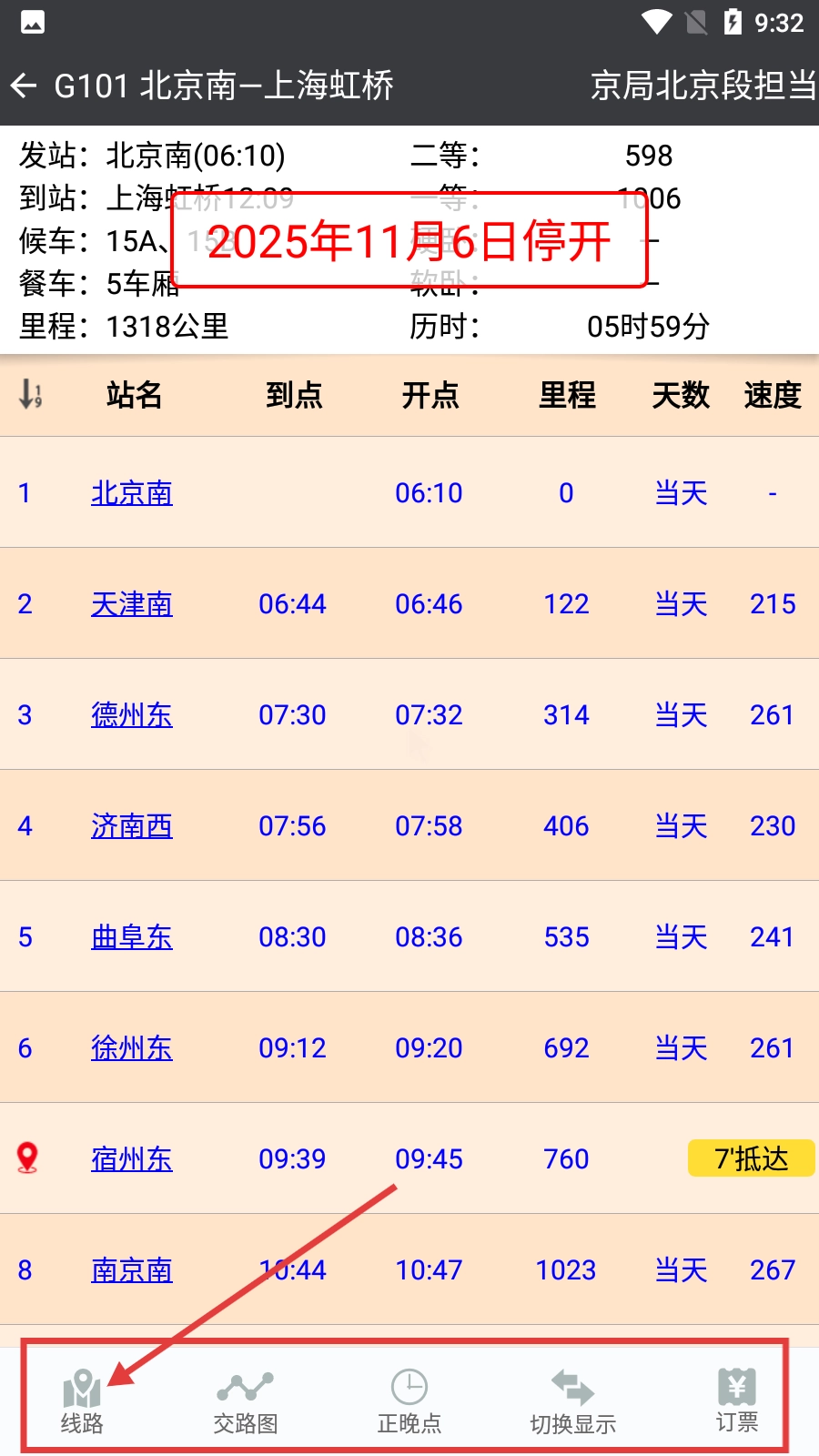 进入车次详情页后,点击页面底部的【线路】按钮,就能查看这趟列车的站点线路信息。
