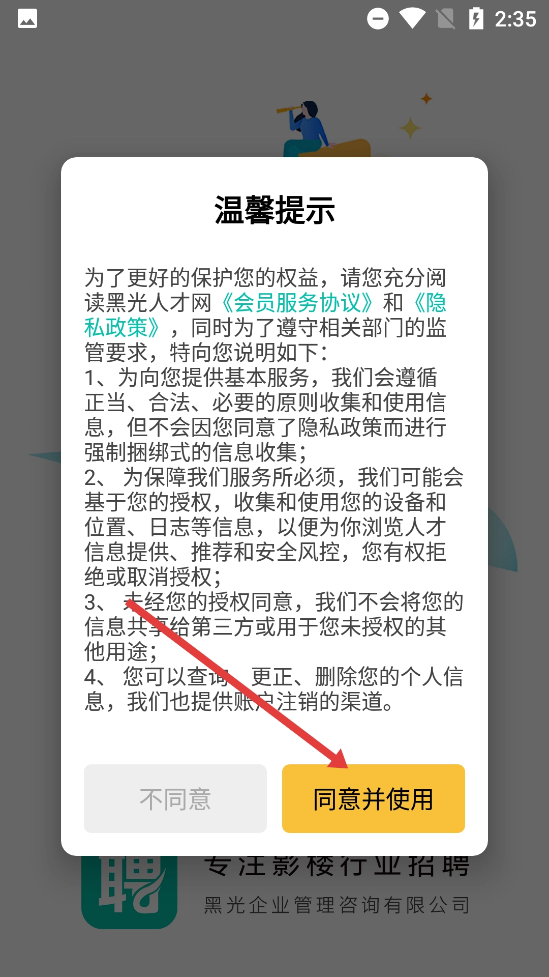 1、点击【同意并使用】按钮,即表示您同意黑光人才网的《会员服务协议》与《隐私政策》,随后将进入应用主界面。
