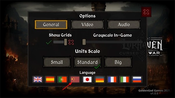 2、进入设置界面后,找到language选项,点击并选择中国国旗对应的选项,即可将游戏语言切换为中文。
