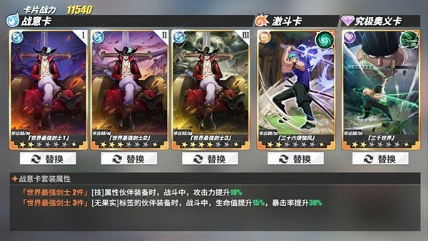 佩戴战意卡时,优先选择与角色自身核心属性(力、技、心)相匹配的卡片;其次,集齐两件套或三件套战意卡还能触发额外的套装属性加成。战意卡的主要获取途径包括无尽模式、勇者挑战以及商店兑换,前期提升角色好感度时,也可将蓝色战意卡用于过渡。