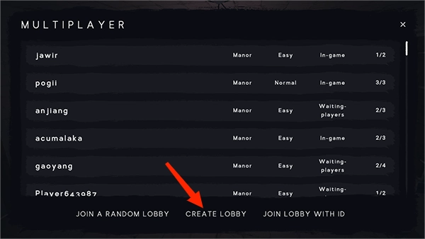 在设定好房间名称、游戏难度与参与人数后,点击“CREATE A LOBBY”按钮,即可完成房间创建。