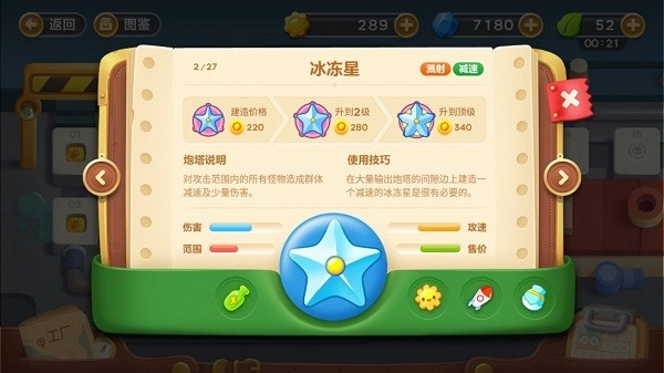 使用技巧:在大量输出炮塔的间隙旁建造一个具有减速效果的冰冻星是很有必要的。