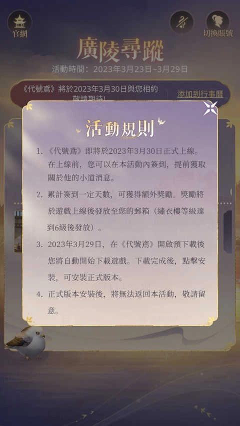 进行游戏如图,游戏当前为预状态,3月30号正式上线;