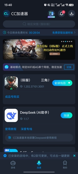 1、首先安装三角洲行动国际服最新版,安装完成后打开加速器(如CC加速器、奇游加速器),找到这个游戏,点击加速;