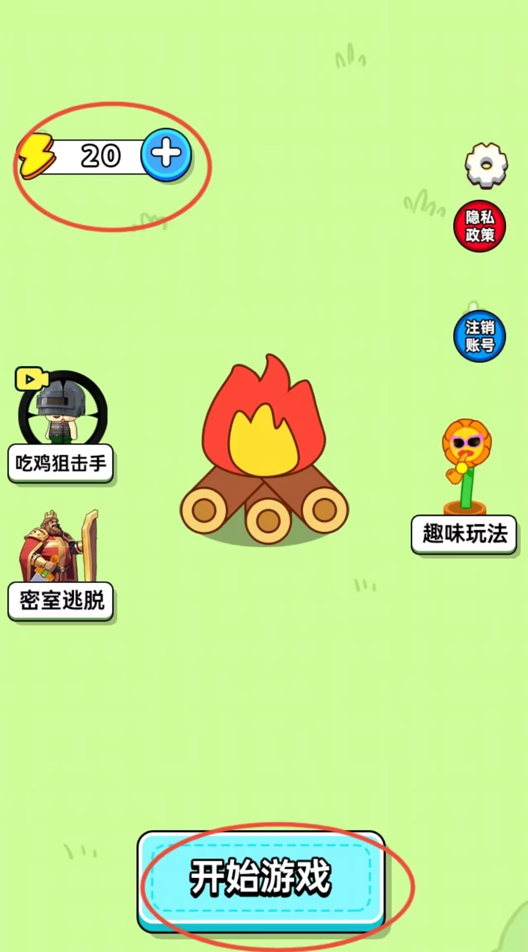1、界面左上角显示当前体力值,左右两侧分别设有密室逃脱与趣味玩法入口,消耗一点体力即可开始消除挑战。