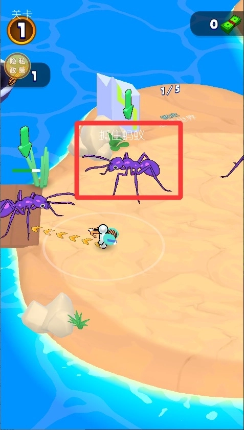 1、左手划屏幕控制角色移动,慢慢靠近目标别惊动它,蚂蚁个头小要凑近才能抓。