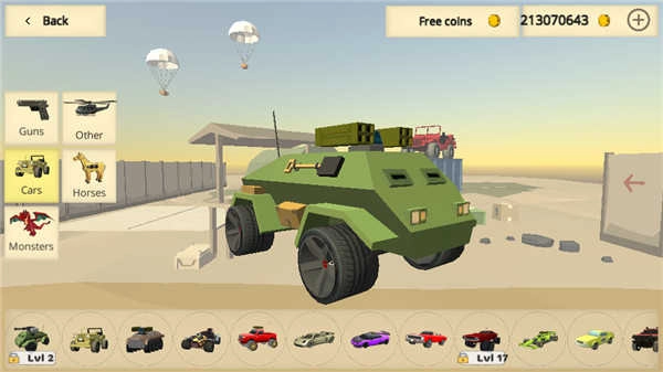 3、通过积累金币,你可以购买枪械、载具如摩托车、直升机甚至恐龙等特殊坐骑,打造专属战斗阵容。