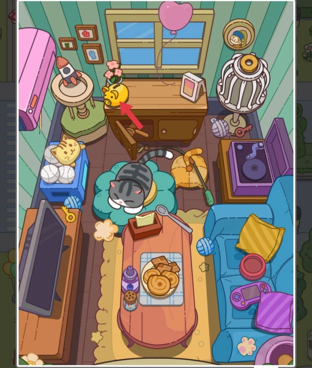 2. 点击左侧柜子,锤子出现,用锤子砸存钱罐(内有金币)。