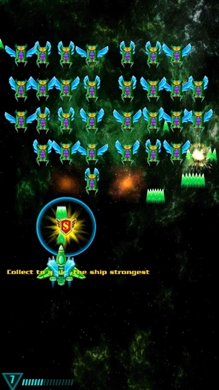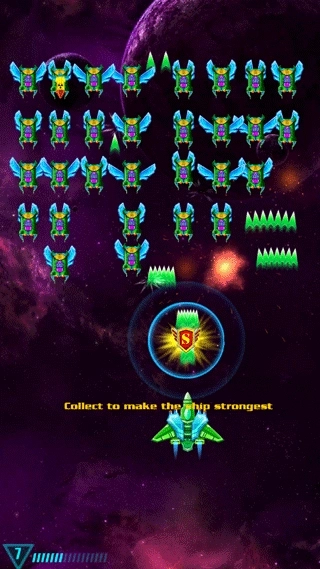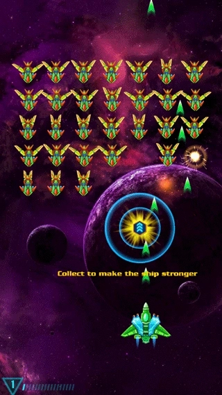 1、它完成了一个身临其境的任务和一个美丽的水平。前进通过入侵者的入侵波,避免落入火箭和收集电源UPS,以提高你的飞船的火力。