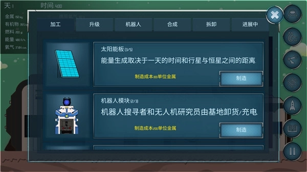 我的步骤安排是:先建造两个机器人模块,之后制作三个太阳能板;把两个灰色的机器人制造单元升级到二级(要是能量供应不足就暂时不升级),再将所有太阳能板都升到二级(这时候金属材料应该就用完了)。