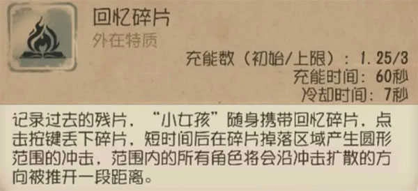 使用【回忆碎片】能够推开监管者,但要是在技能生效前被监管者普通攻击击中,就会取消监管者攻击后的硬直动作。因此在使用该技能时,务必确认自己与监管者之间的距离,以及对方是否有攻击动作,以防因使用时机不对而取消“擦刀”。
