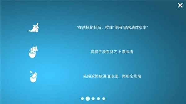 4、选定拖把后长按“使用”按钮,即可清理地面的灰尘;使用腻子修补墙面前,要先把腻子涂抹在刮刀上;刷漆时,先将滚筒放入油漆桶中浸泡,再用它在墙面上均匀涂刷。