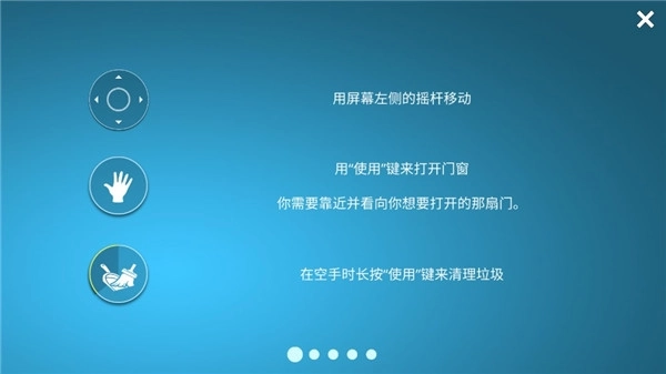 5、角色移动可通过左侧虚拟摇杆来操控,“使用”键的功能是开关门窗,进行操作时要靠近目标并对准它;当处于空手状态时,长按“使用”键还能够清理地面的垃圾,让环境维持整洁。