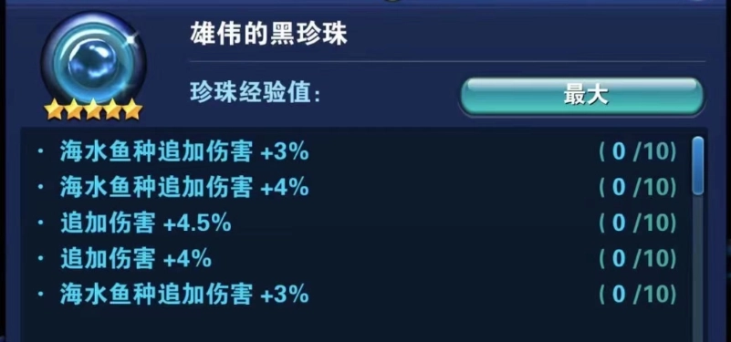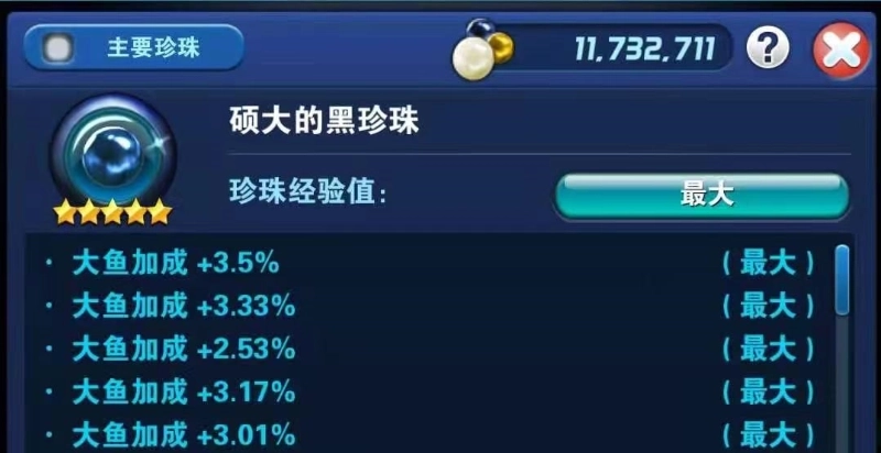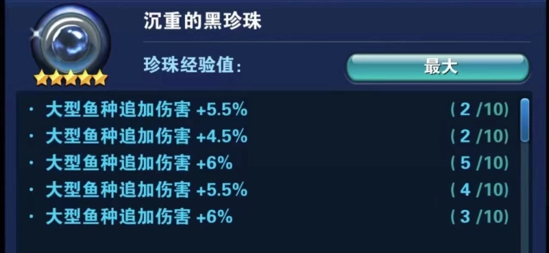 首先,一颗合格的「大鱼珠」,必须是发育成熟的五星珍珠,并且自带三条及以上的「大鱼加成」属性。(单条「大鱼加成」的上限是1.75%,两条的话上限为3.5%,所以至少需要三条以上才有可能合格。)也就是说,一颗三星珍珠至少得有一条「大鱼加成」,四星珍珠至少得有两条「大鱼加成」,不然就可以直接磨成珍珠粉了。另外,要时刻留意「大鱼加成」的总和,单条「大鱼加成」最高只有1.75%,要是已经清楚不可能达到标准,也请直接分解成珍珠粉。