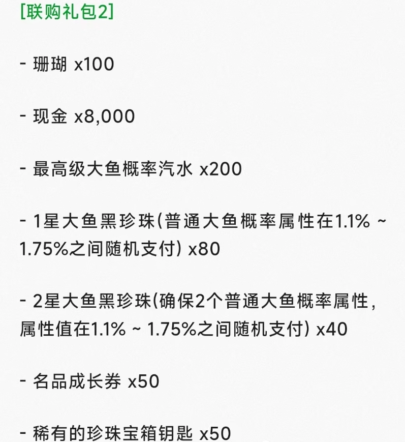 当然,以上所说的都是一般情况,要是礼包里的「大鱼加成」能稳定出英雄或传说级以上的数值,那不用考虑任何条件直接入手就行!(不过这只是假设啦,这种徽章应该不太可能直接售卖。)(另外补充一下,不久前曾推出过一款包含两条「大鱼加成」属性的徽章礼包,两条属性的数值等级都在普通到高级之间。理论上,这种礼包有机会开出「大鱼加成」最高超过14%的神级徽章,数值相当于传说等级,但实际几乎不可能拿到——因为数值大概率会是普通等级且偏低的情况。而且这两条「大鱼加成」分别在徽章的前三条和第五条属性位,第一条或许还能勉强通过挑选控制一下,第二条就全看运气了,导致最终拿到的徽章数值很难符合预期。再加上「大鱼加成」本身会占用徽章的一个能力栏位,等于要放弃一条其他能力,所以我并不特别推荐购买这类徽章。)最后要提醒的是,徽章礼包属于活动类商品,推出形式和新徽章的能力会随运营策略调整,大家购买前还请多留意近期的活动动向。