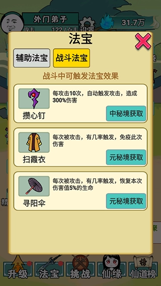 2. 寻觅法宝提升战力,完成挑战获取更多资源。