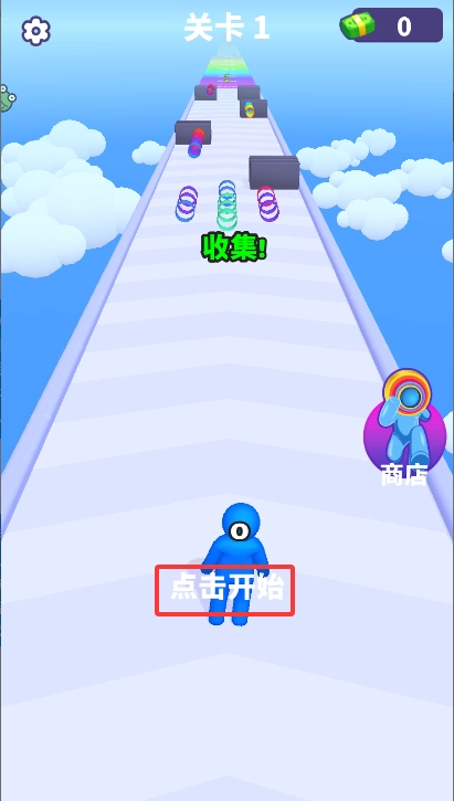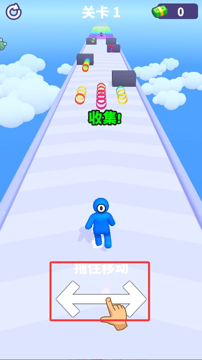 开始游戏后,左右滑动屏幕即可移动人物收集胶圈。