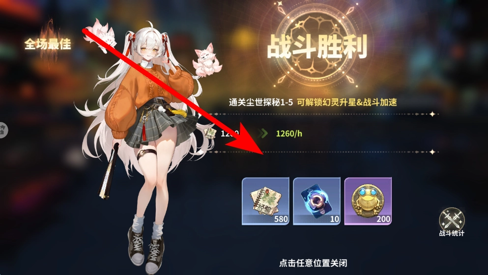 战斗胜利后,会弹出战斗胜利界面,此时可领取各类奖励,包括特定数量的道具等。点击界面任意位置即可关闭该界面,继续后续流程。