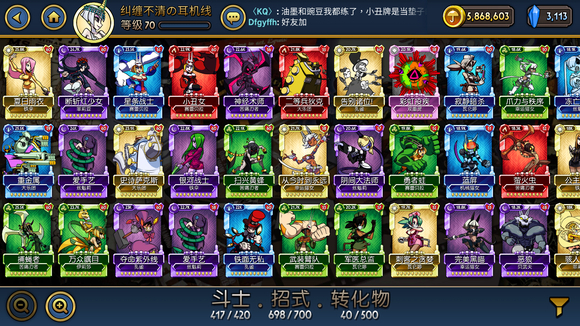 目前游戏内共有13个角色,卡牌稀有度划分为钻、金、银、铜四类,属性则包含光、暗、风、水、火、无六种。属性克制关系为:风克制水,水克制火,火克制风,光与暗互相克制,无属性不存在克制效果。在角色界面中,可查看该角色的招牌技(每张卡牌对应一个)和天元技(每个角色对应一个);技能树界面用于养成角色的基础能力,具体效果可在该界面查看。强化功能是将其他卡牌作为经验喂给目标卡牌,但新手不建议进行此操作——因为角色满级后可升阶至更高稀有度,升阶所需材料为若干张与当前卡牌同角色、同稀有度的卡牌(金升钻除外)。角色界面下方的空槽用于配置技能,相关内容将在后续详细说明。
