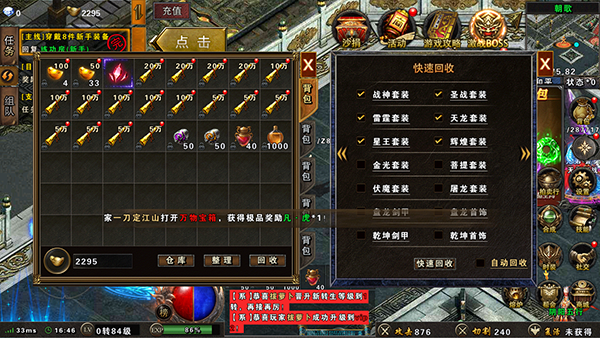 当我们的背包里装备装满了时,就可以点击快速回收功能,把多余的装备转化成金钱。