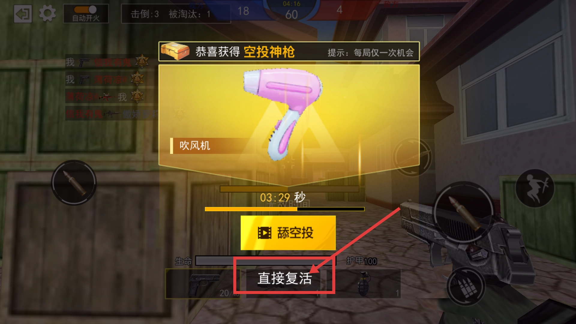 4、当获取【空投神枪-吹风机】后,能够点击【直接复活】,借此迅速重返战场,持续投入战斗,进而提高在战局中的胜率。