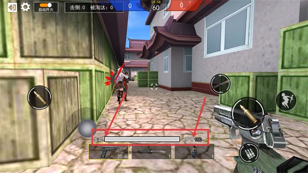 2、在战斗过程中,需留意【生命】与【护甲100】的状态,适时切换【手枪】等武器,并开启自动开火以实现精准攻击。