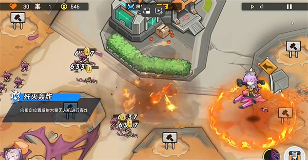 1技能:歼灭轰炸:朝着指定的方位释放大批无人机实施轰炸