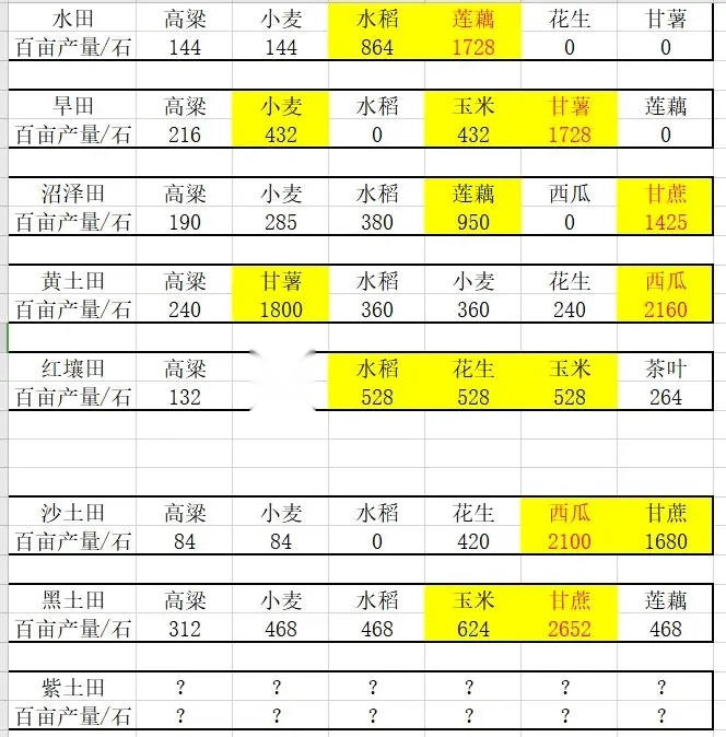 上面标黄的是我个人建议用来进行种田轮换的作物,它们的亩产情况是最高的大于第二高的,第二高的又大于第三高的,以此类推。所以现在明白该怎么操作了吧?