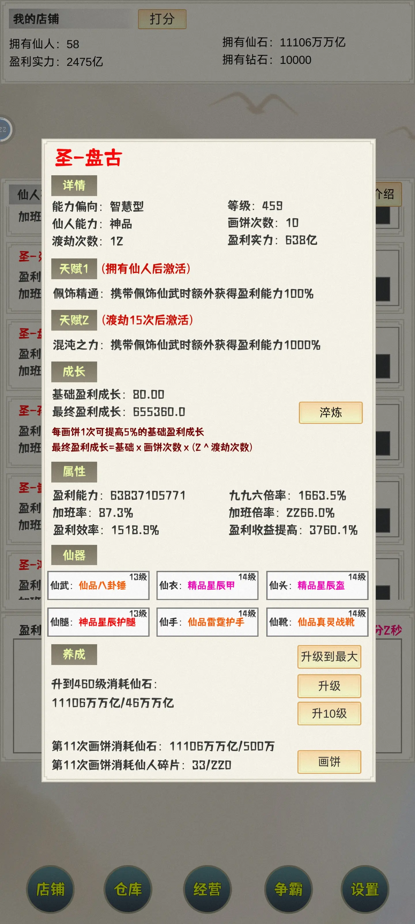 圣-盘古是最强的,不过渡劫15真的纯垃圾,而且给渡劫15加的属性低得离谱,现在我才渡劫12,要5万万万亿才能升满,估计得5天,之后每次渡劫需要的资源都是上次的10倍,所以基本不可能升上去,除非装备特别厉害才行。