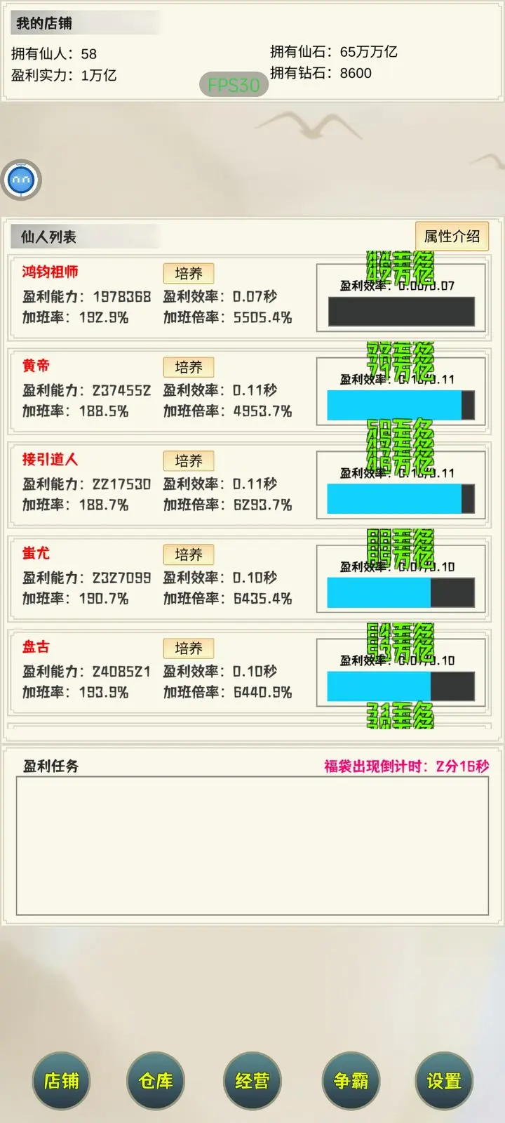 仙石的获取与盈利实力、盈利收益的提升紧密相关,盈利实力越强、盈利收益越高,每小时能得到的收益就越多。我测试过,四个主力角色带盈利收益和不带盈利收益时,获得的仙石数量能相差6到8倍以上——比如前者10小时能拿1000万万亿,后者能拿到6000万万亿。