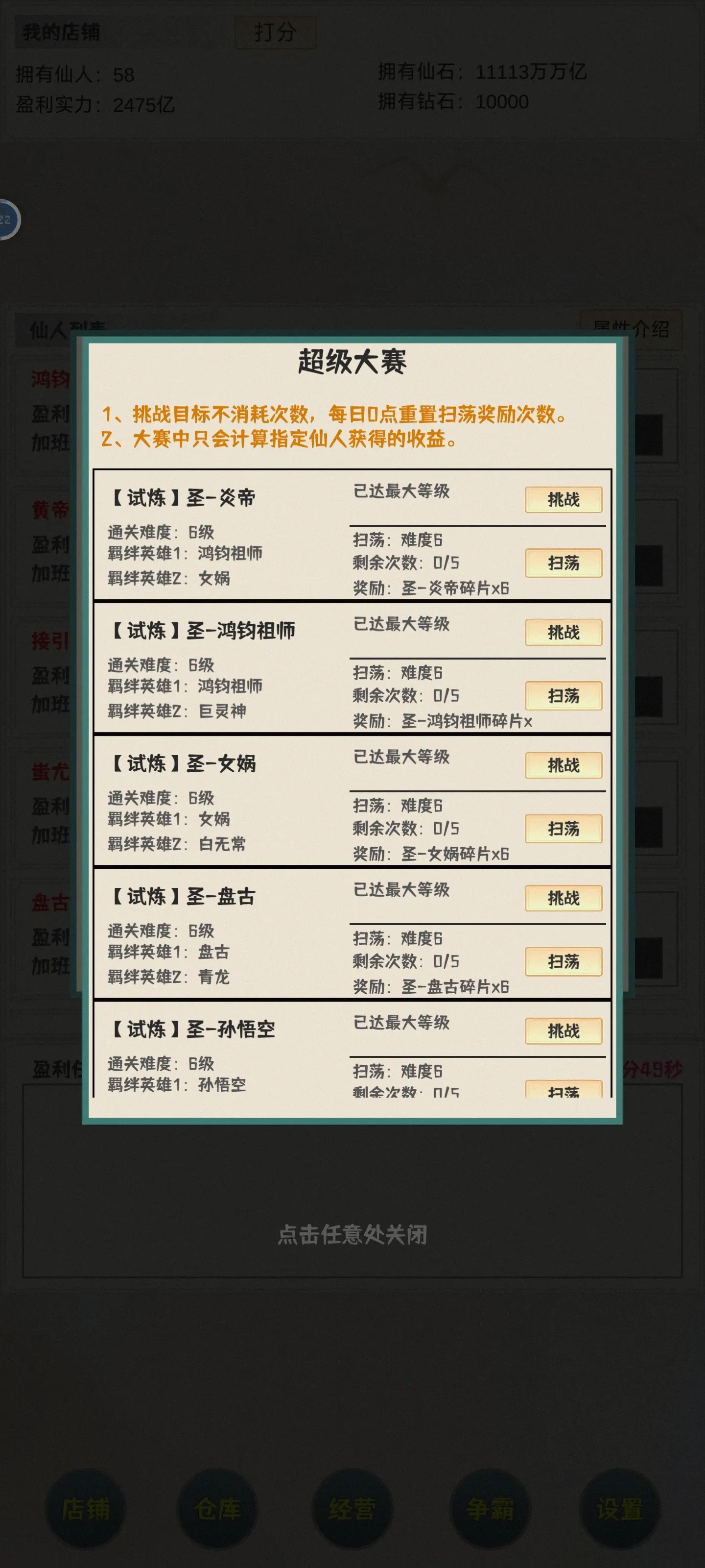 超级大赛最多有6层,差不多7级装备的满仙灵套就能通关(需要魔化和升华10),把仙灵套依次给每个BOSS羁绊1的英雄装备上就行。