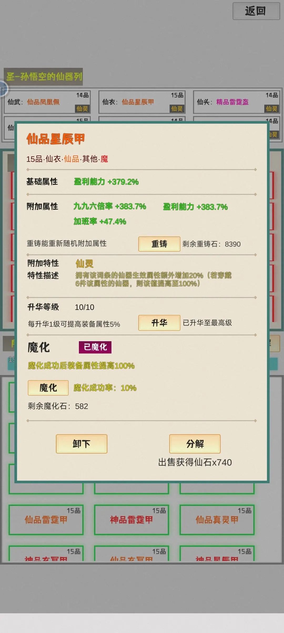 仙石可以通过看广告获取,要是打算长期玩的话,花30块钱开个永久会更方便。仙石建议只用来买魔化石、升华石和金灿灿铜牌这几样东西。魔化石不用囤太多,够主力装备用就行,它的作用是有概率刷新装备的附加特性,到了后期可以用魔化来刷带四属性的仙灵装备,我现在也就刷出两件,概率确实挺低的。装备升华到10级的话,一般得用700个升华石。至于金灿灿铜牌,纯粹是为了后面刷仙灵套装准备的。